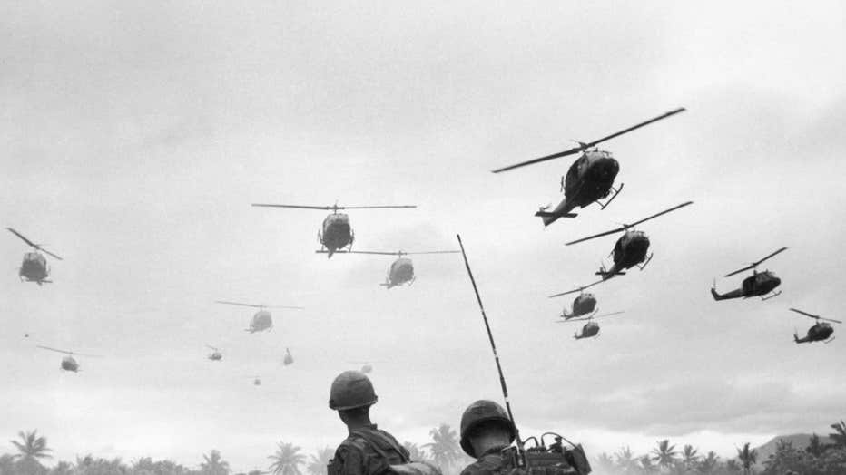 The second wave of combat helicopters of the 1st Air Cavalry Division fly over an RTO and his commander on an isolated landing zone during Operation Pershing during the Vietnam War. (Photo by Patrick Christain/Getty Images)