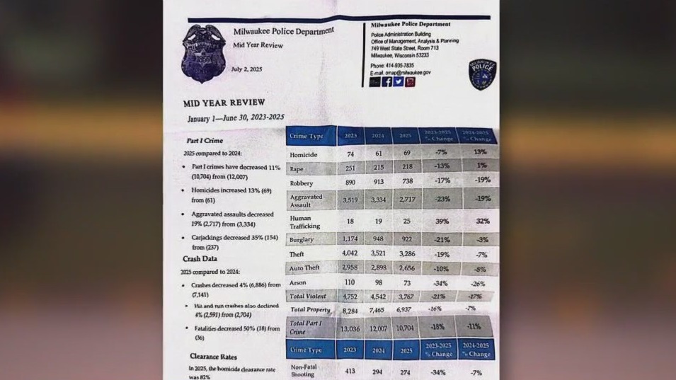 The Milwaukee Police Department released its mid-year crime report, providing data from the first six months of 2025, on Wednesday.