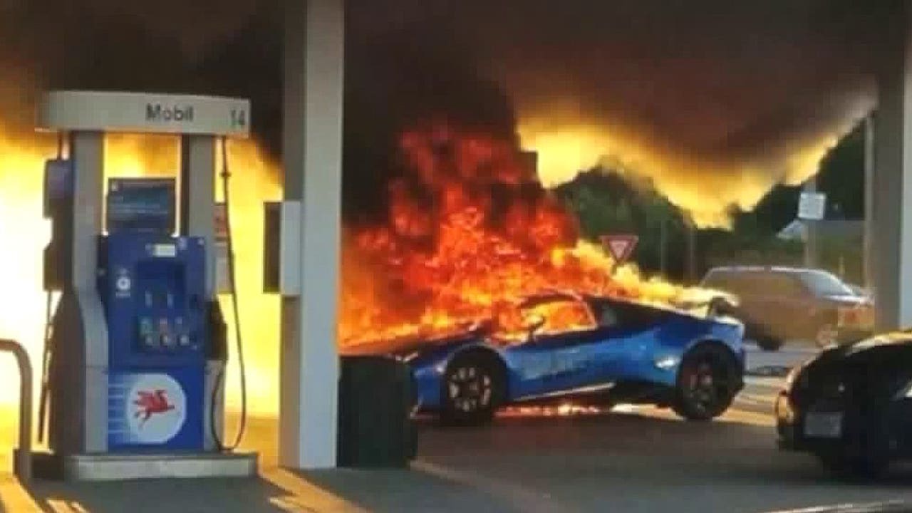 $400,000 Lamborghini Huracan goes up in flames after minivan rips off gas pump nozzle
