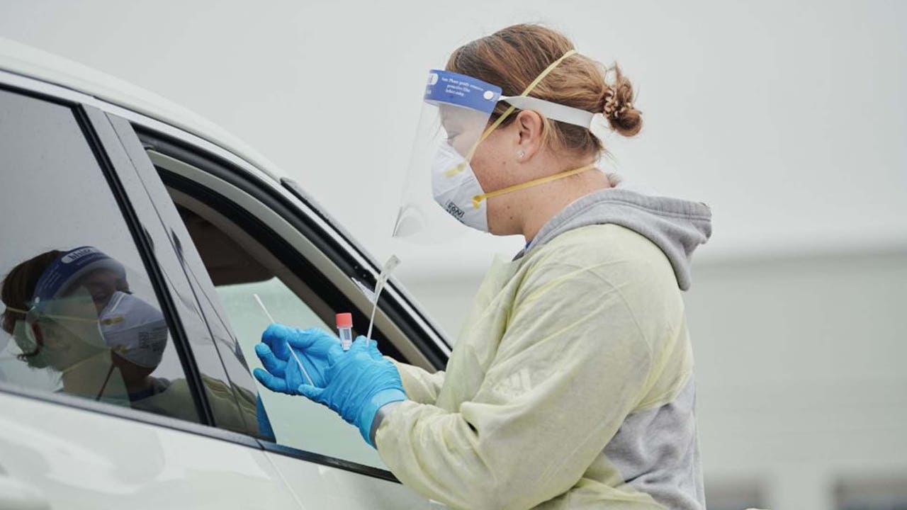 FILE - A healthcare worker administers a COVID-19 test. (Dan Brouillette/Bloomberg via Getty Images)