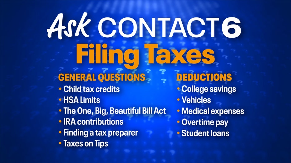 Questions can be about: child tax credits, HSA limits, the One, Big Beautiful Bill Act, IRA contributions, finding a tax prepare, and taxes on tips. We're also fielding questions on deductions for college savings, vehicles, medical expenses, overtime pay and student loans.