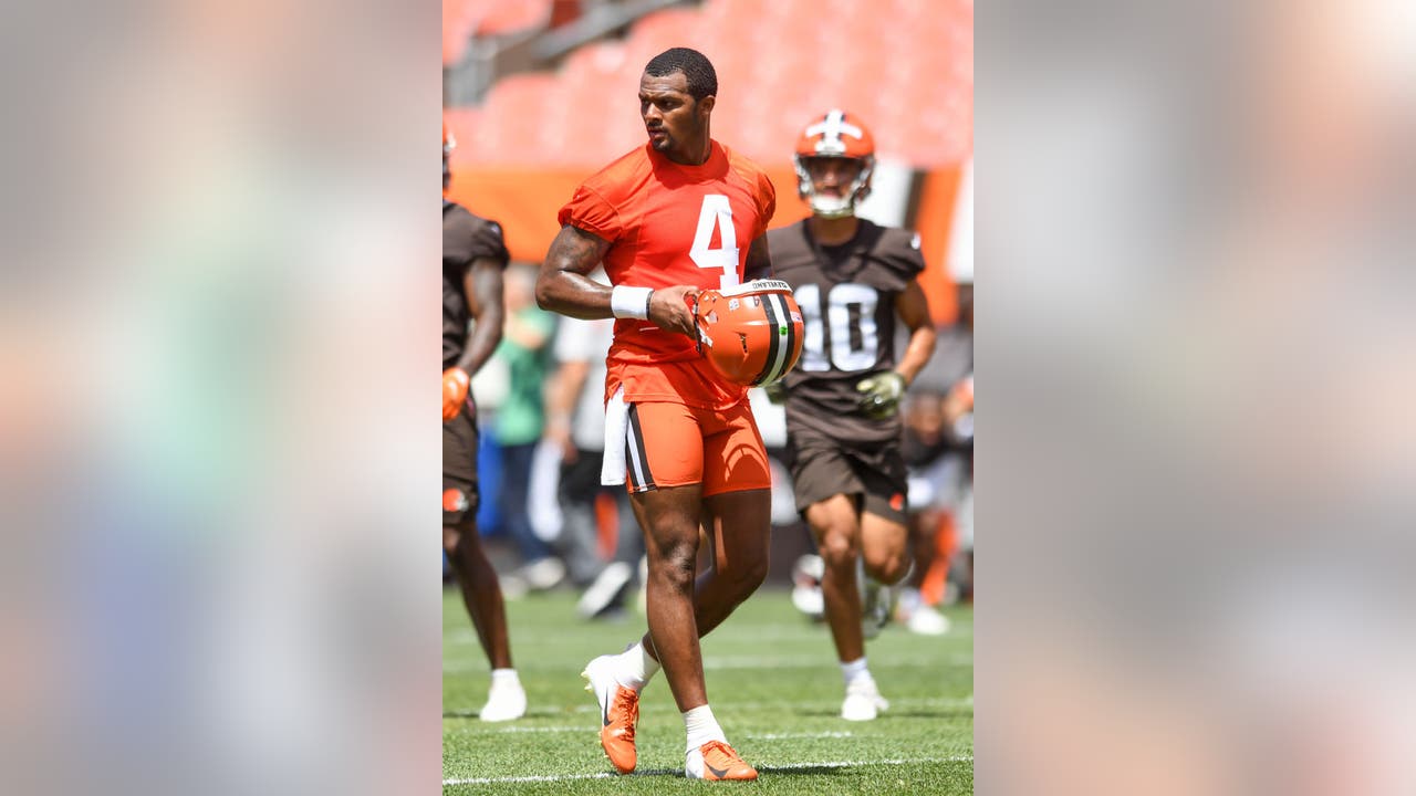 CLEVELAND, OH - JUNE 16: Deshaun Watson #4 of the Cleveland Browns looks on during the Cleveland Browns mandatory minicamp at FirstEnergy Stadium on June 16, 2022 in Cleveland, Ohio. (Photo by Nick Cammett/Diamond Images via Getty Images)