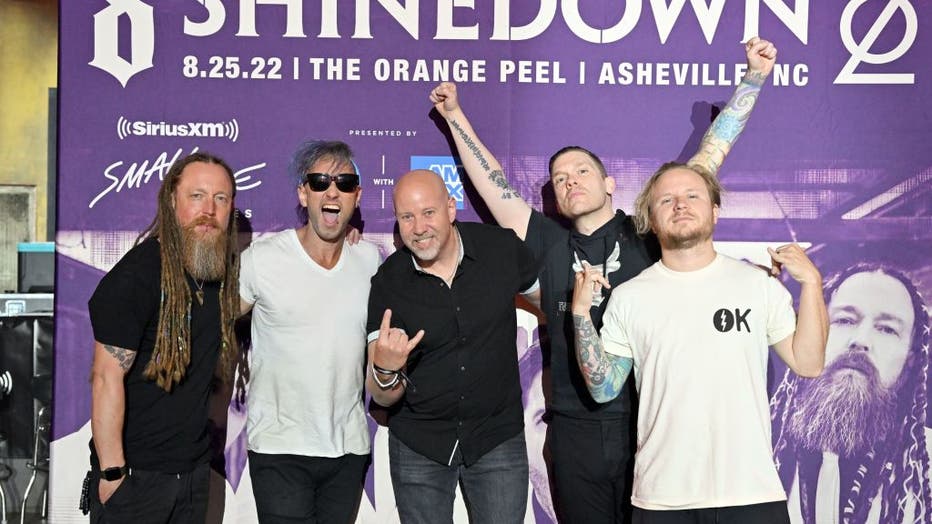 ASHEVILLE, NORTH CAROLINA - AUGUST 25: Zach Myers, Eric Bass, Erik Luftglass, Barry Kerch and Brent Smith of Shinedown attend SiriusXM's Small Stage Series presented by American Express at The Orange Peel on August 25, 2022, in Asheville, North Carol