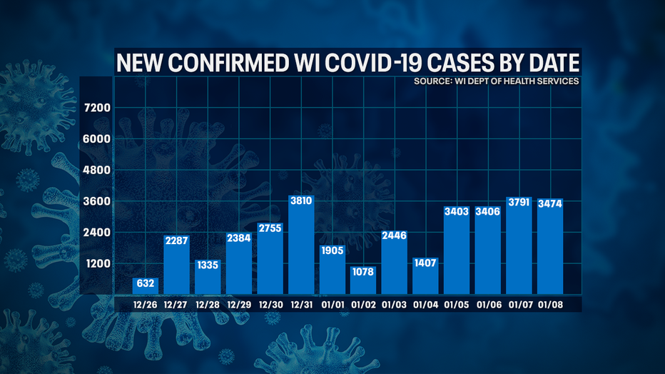 MADISON, Wis. - The number of positive cases of COVID-19 in Wisconsin rose by 3,474 Friday, Jan. 8, officials with the Wisconsin Department of Health Services reported, for a total of 502,012.