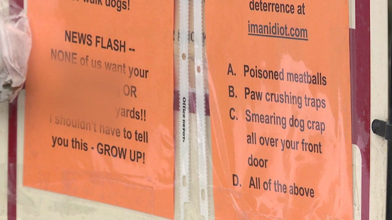 Disturbing sign threatens dogs defecating on neighborhood lawn