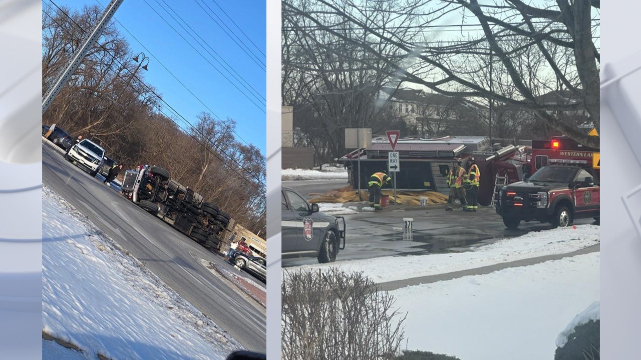 Fire truck rolls onto side while responding to Delafield apartment fire
