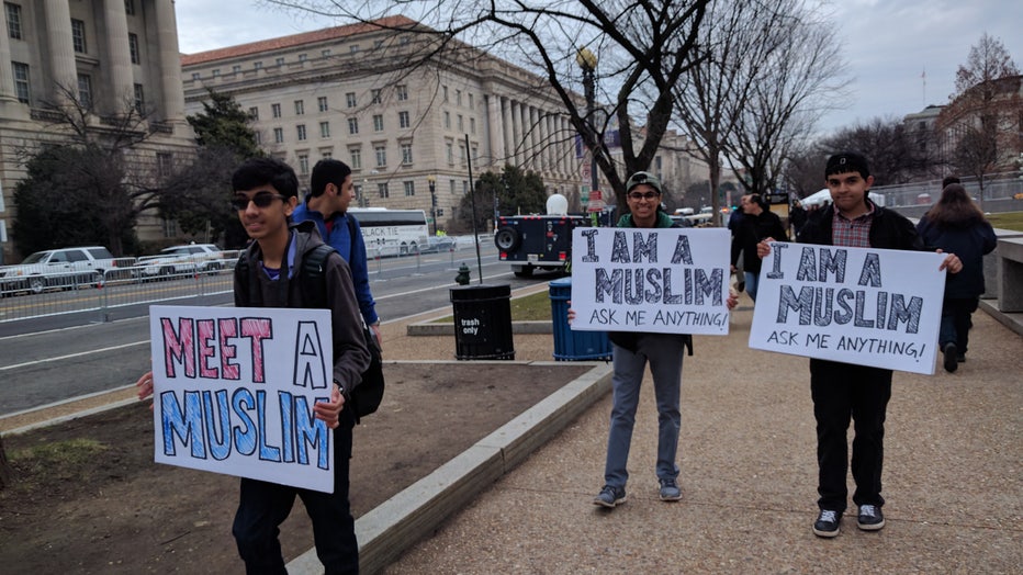 Faran Chowdhry, who woke up at before 6 a.m. to travel into Washington from his home in northern Virginia, said that willingness to listen to others was missing most from national dialogue—and he wanted to use the day to try and change that. The 16-year-old had come to Washington with three other Muslim young men, who were all carrying signs reading “Meet a Muslim.” On the back, they’d written “Ask Me Anything.” Throughout the day many did, and the young men patiently answered their questions.