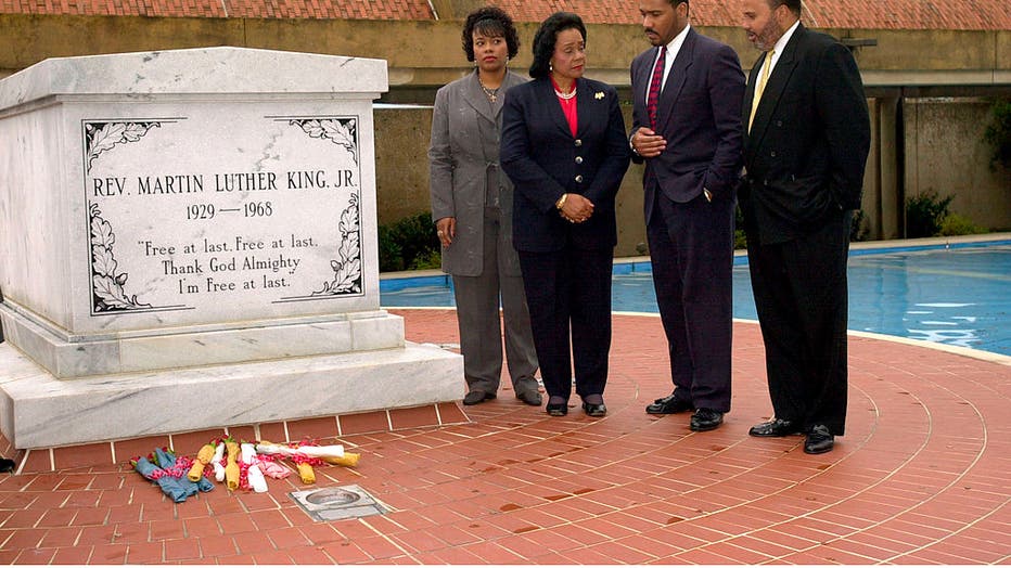 N 361472 005 09 Dec 99 Atlanta, GA Members of the King family pause at the tomb of slain civil rights leader Martin Luther King Jr, after laying roses following an Atlanta press conference, on Thursday, Dec. 9, 1999, to react to a Memphis civil jury'
