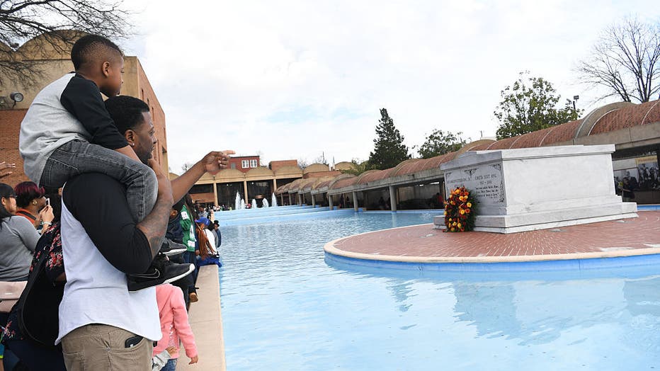 ATLANTA, GA - JANUARY 16: Father and son visit the tomb of Martin Luther King Jr. and Coretta Scott King during 2017 Martin Luther King Jr. Day March and Rally at the MLK Center on January 16, 2017 in Atlanta, Georgia. (Photo by Paras Griffin/Getty I