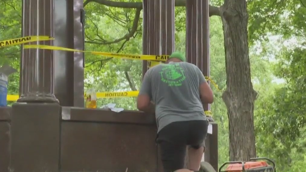 Jacob Bunk works on repairs to the Humboldt Park World War I memorial