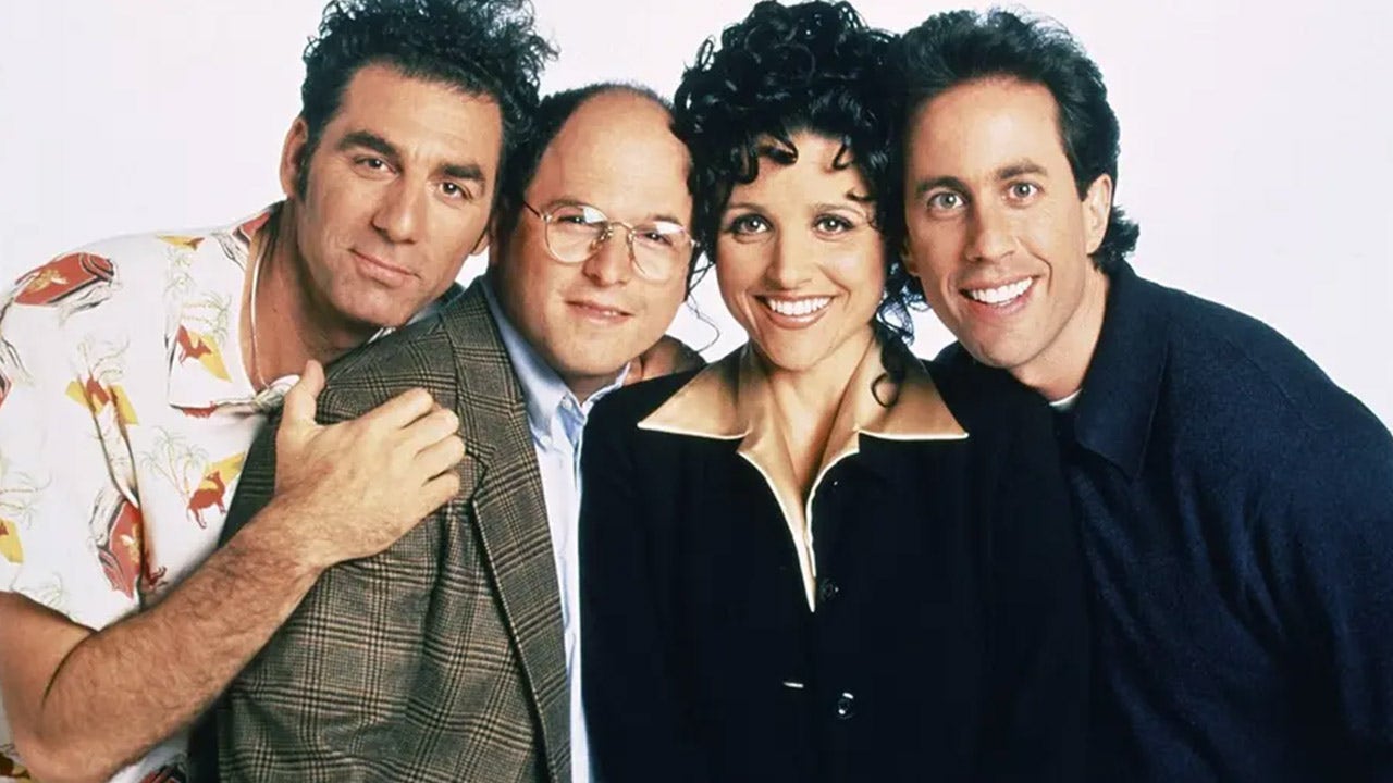 From left to right, Michael Richards as Cosmo Kramer, Jason Alexander as George Costanza, Julia Louis-Dreyfus as Elaine Benes, Jerry Seinfeld as Jerry Seinfeld. (Credit: Andrew Eccles/NBCU Photo Bank/NBCUniversal via Getty Images via Getty Images)
