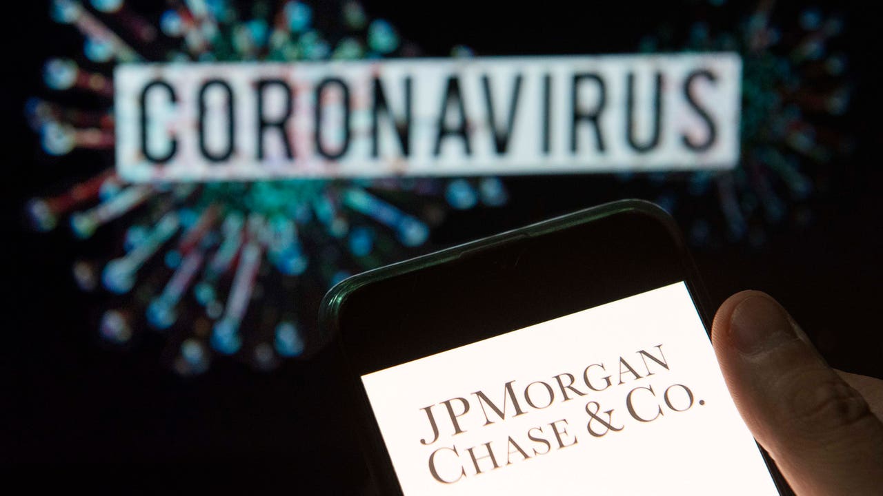 A photo illustration shows the American multinational investment bank and financial services company JPMorgan Chase & Co. logo on a smartphone with a computer model of the COVID-19 coronavirus on the background. (Photo Illustration by Budrul Chuk