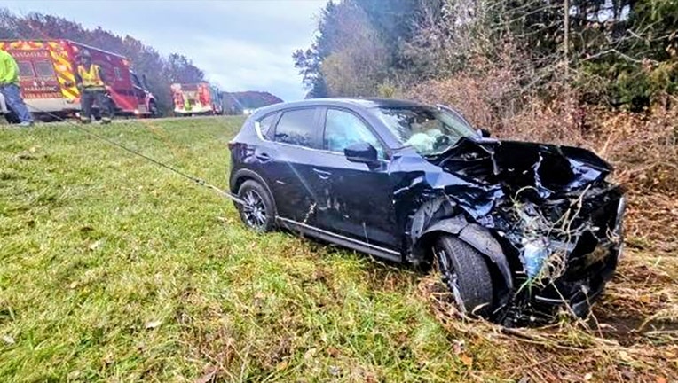 The SUV was found in a ditch roughly 60 feet from the roadway. KFRD said it rolled over and came to a rest upright after apparently hitting the buck. The SUV had extensive front-end damage and full airbag deployment.