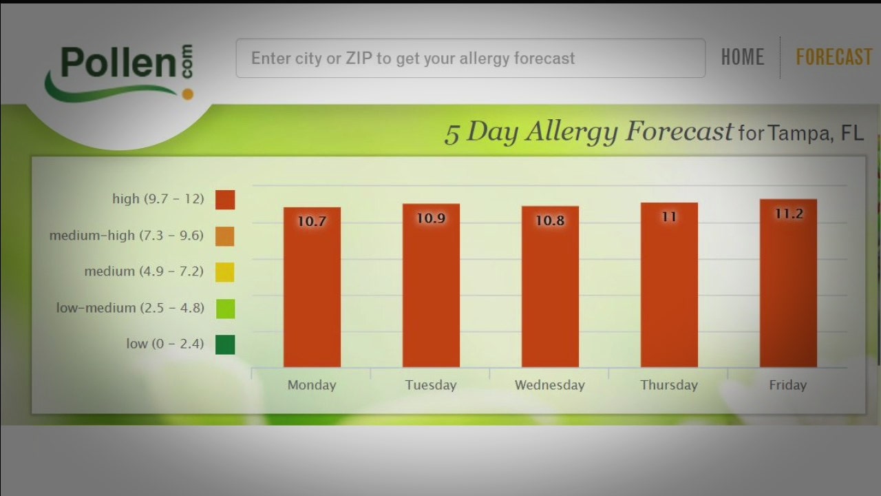 The allergy forecast from pollen.com shows extremely high levels the rest of this week in Tampa, hovering right around 11 on a scale with a maximum of 12.