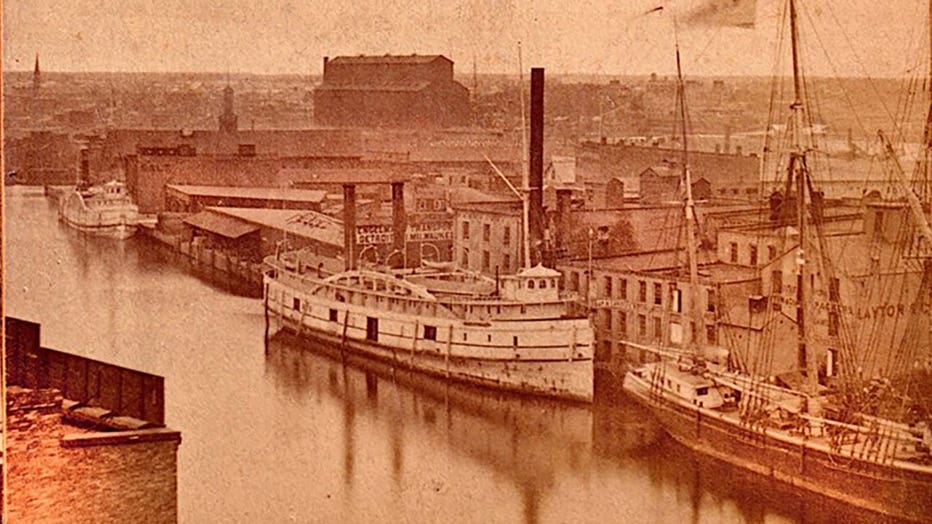 This image shows the Lac La Belle at her dock in Milwaukee in 1872. It is from an original stereoview by W.H. Sherman in the Brendon Baillod Collection. (Brendon Baillod)