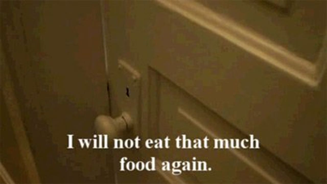 Little boy realizes he ate too much, and...