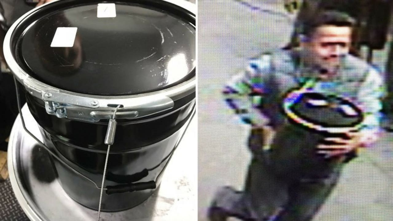 In the surveillance footage released by the NYPD, a man walks up to the back of the truck, grabs the bucket, and shuffles off with it in broad daylight. At first, he's about to walk past the truck, but then he notices the unattended bucket and makes a turn to grab it.
