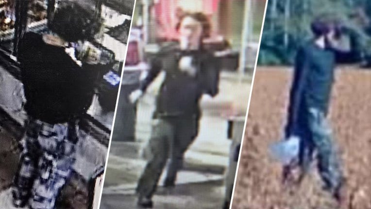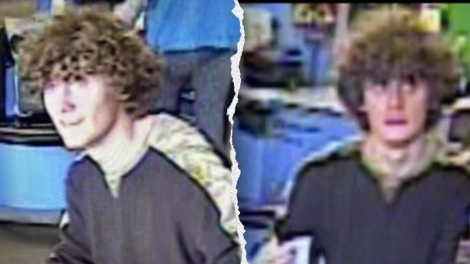 Low-resolution still images taken from surveillance video show Dominic Connelley in what appears to be a Walmart checkout area. The 24-year-old is wanted on charges including murder, arson and attempted murder in the death of his grandmother and a de