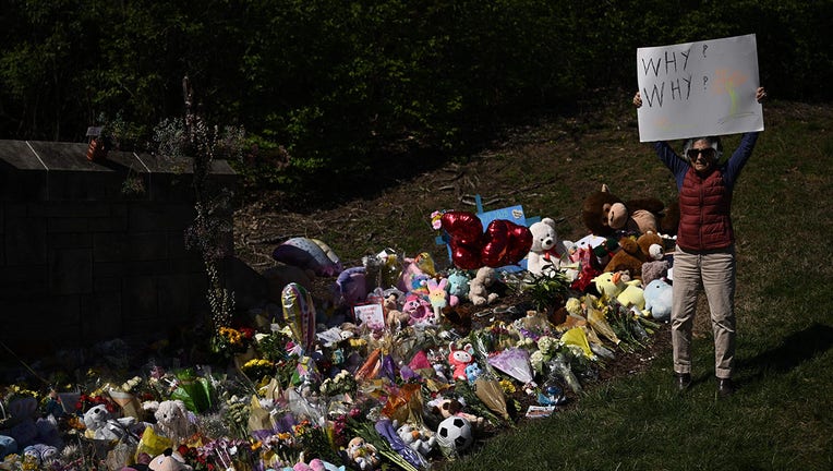 Mary Habibian holds a sign that read "Why? Why?" at a makeshift memorial for victims of a shooting at the Covenant School campus, in Nashville, Tennessee, March 29, 2023. - A heavily armed former student killed three young children and three staff in