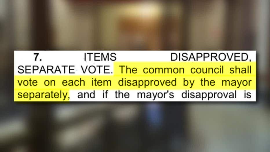 City Clerk Jim Owczarski says he satisfied the law by saying all the mayor's vetoes right before the council voted the one time, so the alders didn't need to have separate votes. Common Council members told FOX6 they think the vote was legal.