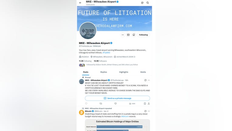 MILWAUKEE - The official X (formerly Twitter) page for Milwaukee Mitchell Airport has apparently been hacked, having been taken over by an entity purporting to be a law firm promoting Bitcoin services.