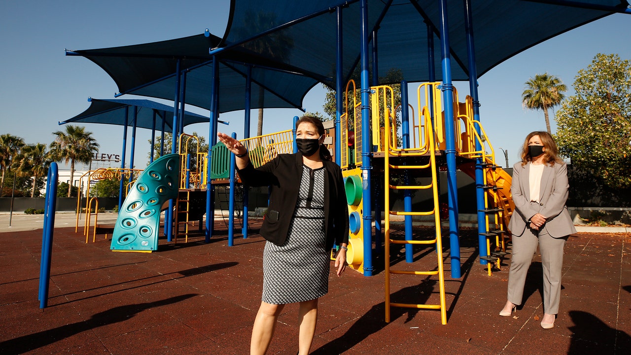 FILE - Principal Perla Chavez-Fritz, left, of Cerritos Elementary in Glendale and Los Angeles County Office of Education Supt. Debra Duardo, right, tour of Cerritos Elementary in Glendale, Calif.