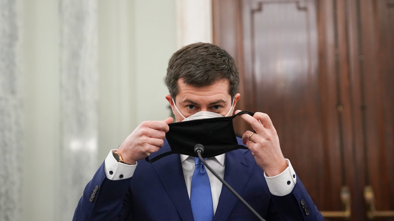 FILE - Pete Buttigieg, nominee for US Transportation Secretary, puts on his mask at his confirmation hearing before the Senate Commerce, Science, and Transportation committee in Washington, DC, on Jan. 21, 2021 (STEFANI REYNOLDS/POOL/AFP via Getty Images)