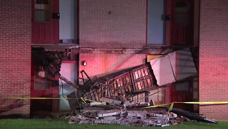 St. Francis Fire Chief Nicholas Poplar said it happened around 8 p.m. at a two-story apartment building near Kansas and Whitnall around 8 p.m. He said the exterior balcony on one side of the building collapsed into a pile of debris.