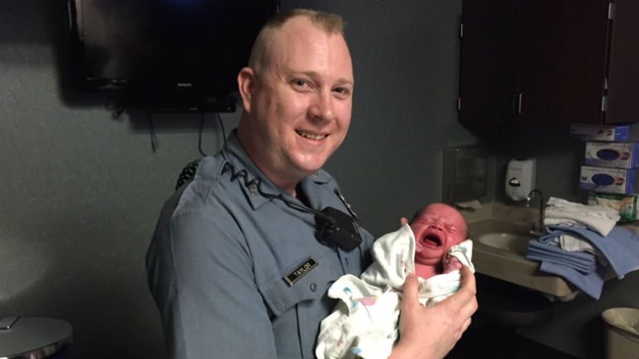 With the father on the phone with 911, the mother began pushing in the passenger seat -- and minutes later, Taylor single-handedly delivered a healthy baby boy.