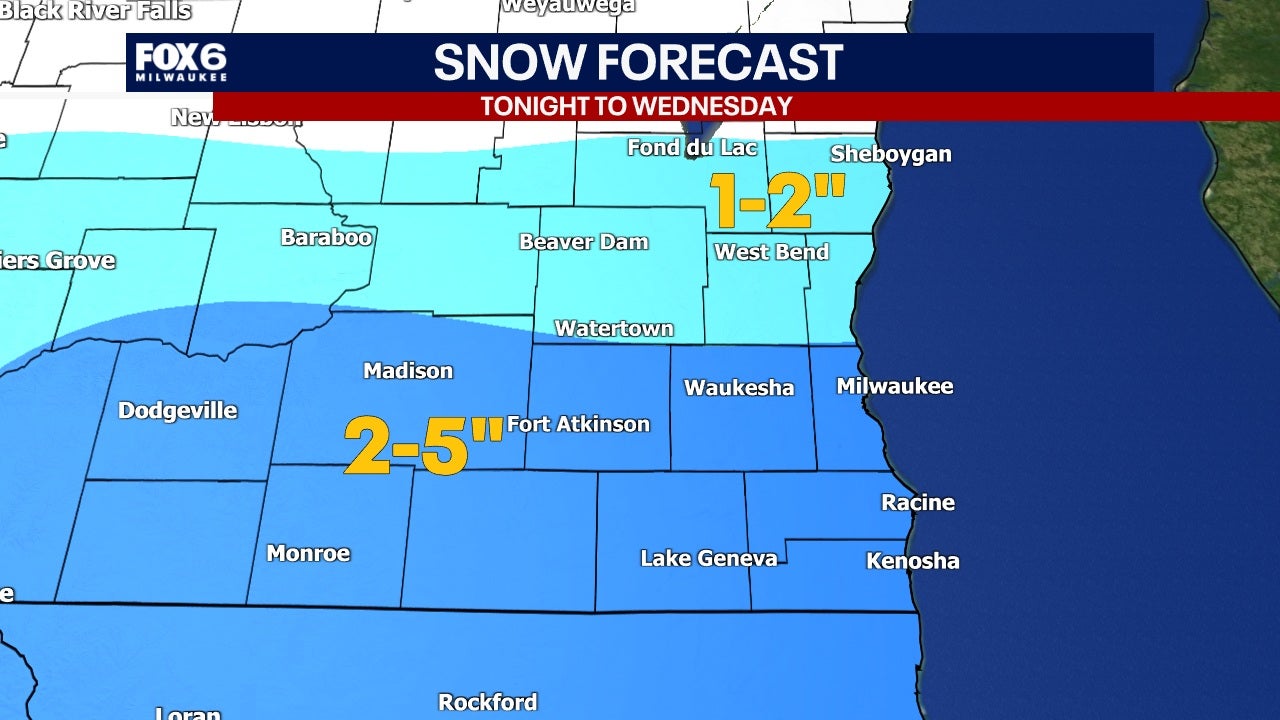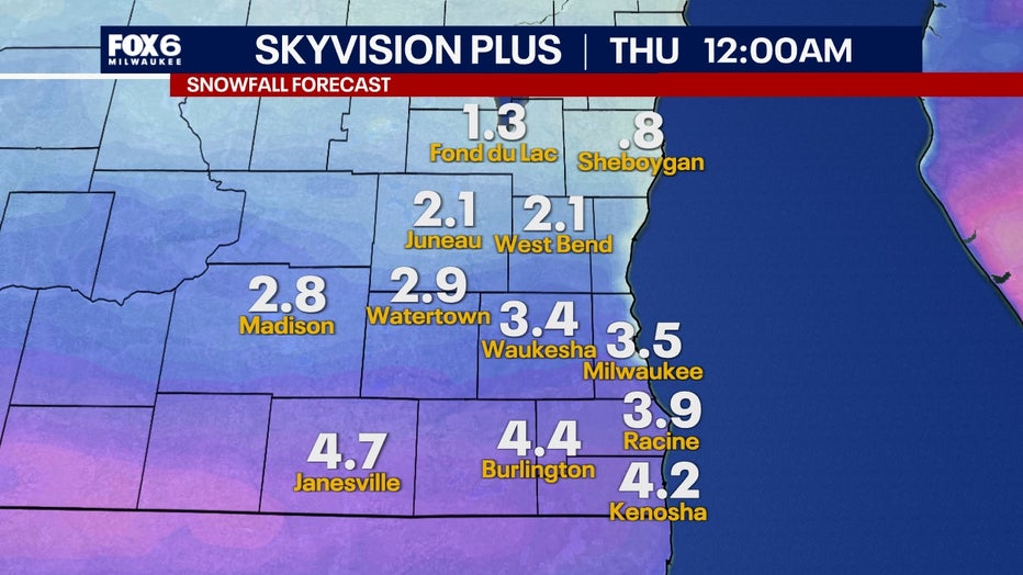 Around 2–5" of snow will be possible along and south of I-94, with highest totals along the Illinois state line. Lesser amounts of 1–2" are expected north. Expect a slow-go for travel and some shoveling in the morning.