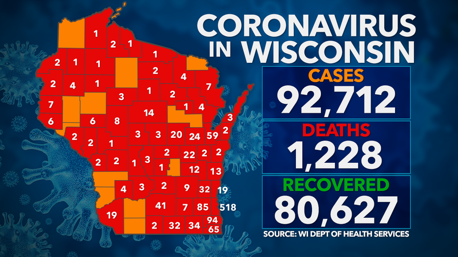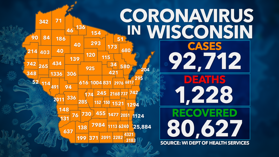 In total, 92,712 people have now tested positive for COVID-19 in Wisconsin. There have been 1,228 deaths, according to the DHS.