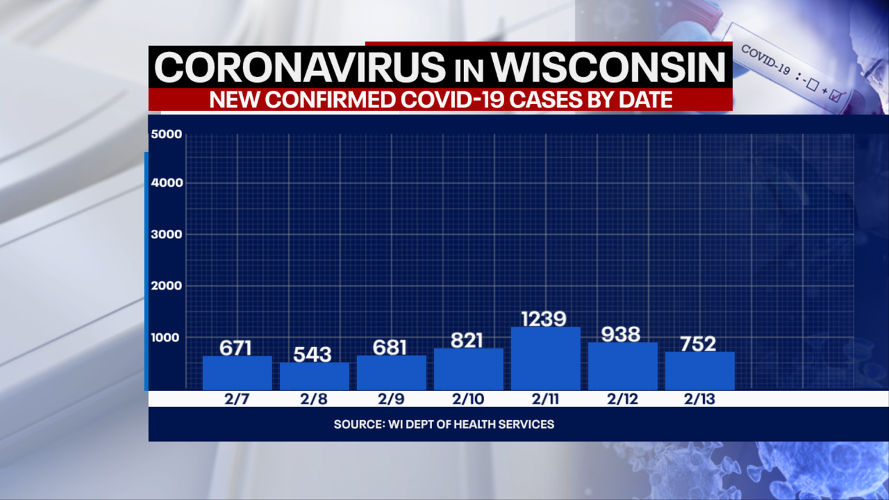 MILWAUKEE - The number of positive cases of COVID-19 in Wisconsin rose by 752 Saturday, Feb. 13, officials with the Wisconsin Department of Health Services (DHS) reported, for a total of 554,800.