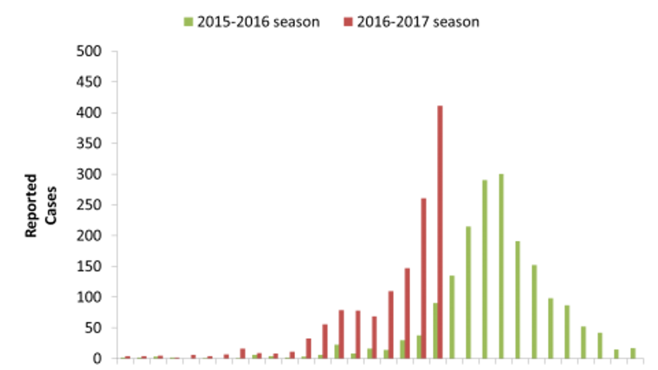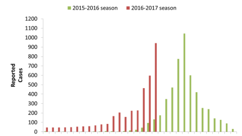There are also more hospitalizations for influenza this year than during the same time last year. To date, there have been over 1200 hospitalizations of people with influenza, compared to just 235 during the same period last year.