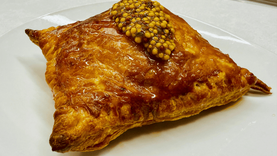 The Porky Puff is a golden, flaky puff pastry filled with tender pulled pork, house-made zesty peach filling, layered with creamy garlic and herb cheese for a rich, savory bite. Baked until light and crispy, finished with a drizzle of hot honey, and a sprinkle of mustard seeds, this Puff delivers the perfect balance of sweet heat and tang. Handheld and packed with bold flavor, it’s an easy-to-eat indulgence that hits every note in one irresistible square!