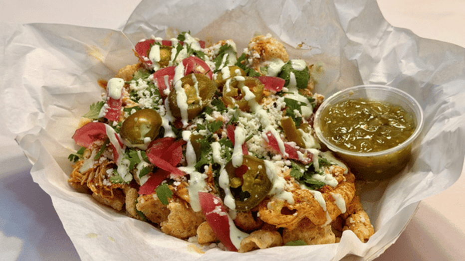 Tinga Tango Chicharrones is a dish created to be the ultimate sweet-heat showstopper. A savory stack of house-made crispy honey-habanero pork rinds topped with smoky chicken tinga, tangy pickled red onions, creamy queso fresco, cotija cheese, sweet and spicy candied jalapeños, and fresh cilantro. Finished with a drizzle of silky cilantro-lime crema and served with vibrant salsa verde for dipping, drizzling, and devouring.