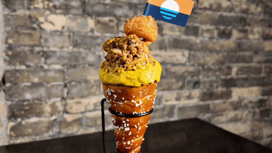 The Cream City Cone is a handheld creation that delivers a flavorful, fully loaded bite from the top down. This warm, buttery pretzel cone is dipped in Milwaukee Pretzel Company Dill Pickle Mustard, packed with a savory mix of bratwurst, sautéed onions, sautéed mushrooms, and melted cheddar, and then topped with a breaded white cheddar cheese curd and more mustard. It’s a brat … in a cone … and somehow, it all makes perfect sense!