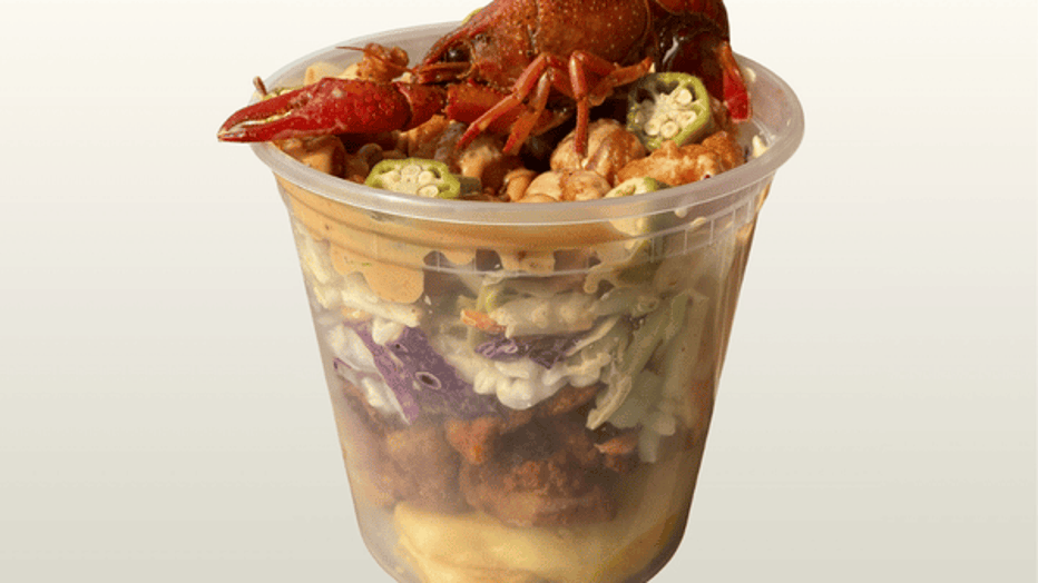 Bayou Crunch Cup is a towering cup of southern comfort, stacked with crispy sidewinder fries, Cajun slaw and tender alligator nuggets. Breaded crawfish bites and a rich comeback sauce add a bold, zesty kick in every layer. Finish this dish off with pickled okra and a whole crawfish on top for big bayou flavor and a true Fair wow factor.