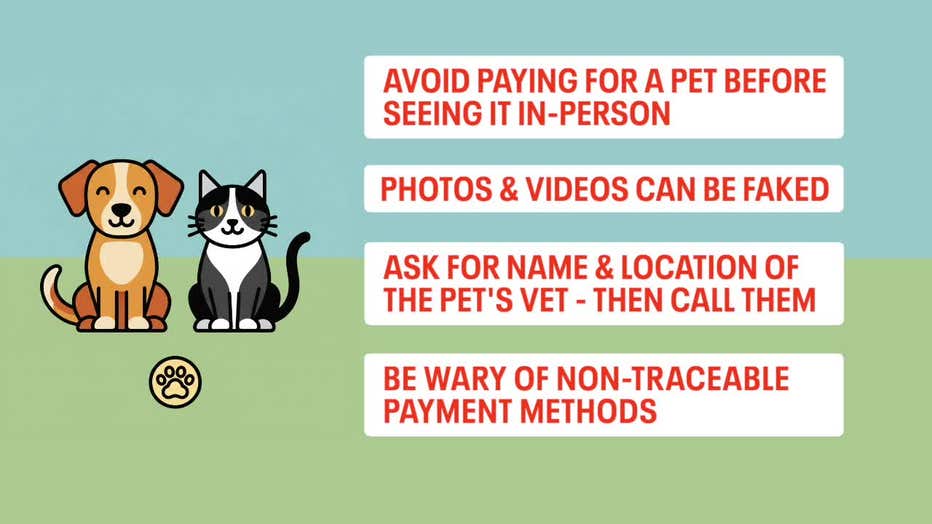 DATCP advises that you avoid paying for a pet before seeing it in person. Remember that photos and videos can be faked. Ask for the name and location of the pet's veterinarian and call them. Be wary of non-traceable payment methods.