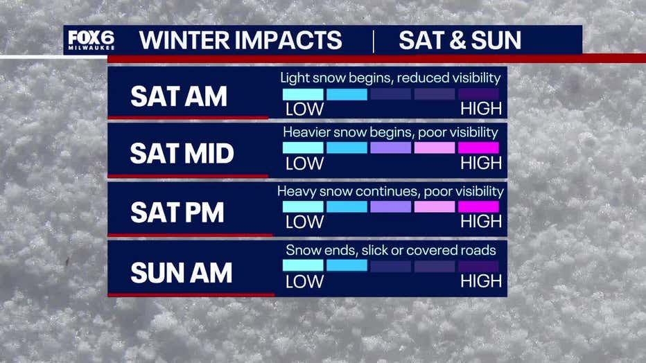 FOX6 Weather Experts said light snow will fall in the morning. Heavy snow and poor visibility are expected in the afternoon, continuing through the night and ending on Sunday morning.