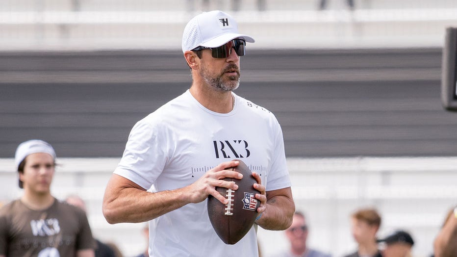 Aaron Rodgers gets ready to throw a football during RX3's Celebrity Flag Football Tournament at Saddleback College on March 15, 2025 in Mission Viejo, California. (Photo by Aubrey Lao /Getty Images)