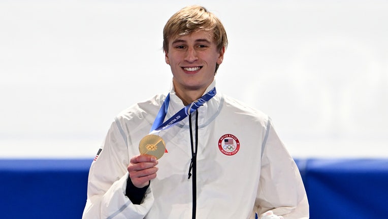 11 February 2026, Italy, Mailand: Olympia, Olympic Winter Games Milan Cortina 2026, speed skating, 1000 m, men, winner Jordan Stolz (USA) celebrates with his gold medal. Photo: Peter Kneffel/dpa (Photo by Peter Kneffel/picture alliance via Getty Imag
