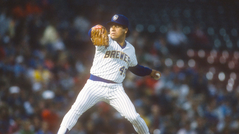 MILWAUKEE, WI - CIRCA 1987: Teddy Higuera #49 of the Milwaukee Brewers pitches during a Major League Baseball game circa 1987 at Milwaukee County Stadium in Milwaukee, Wisconsin. Higuera played for the Brewers from 1985-91 and 1993-94. (Photo by Focu