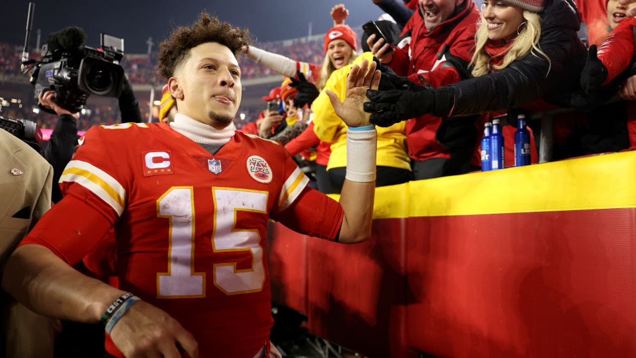 KANSAS CITY, MISSOURI - JANUARY 23: Patrick Mahomes #15 of the Kansas City Chiefs celebrates with fans after defeating the Buffalo Bills in the AFC Divisional Playoff game at Arrowhead Stadium on January 23, 2022 in Kansas City, Missouri. The Kansas