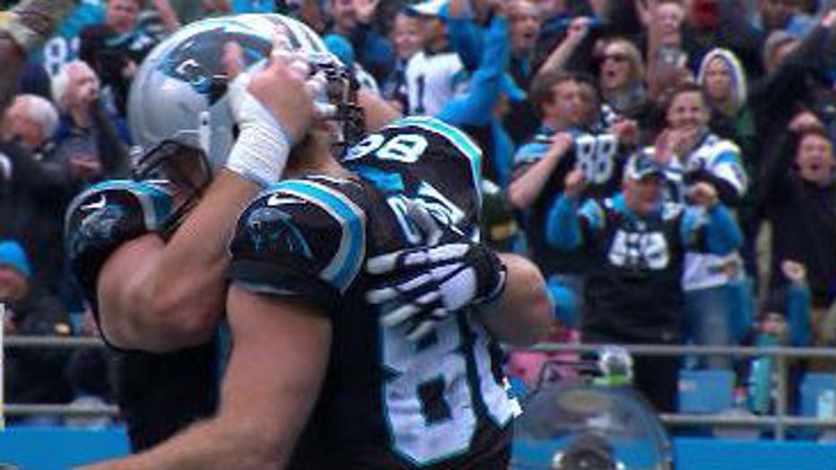 Panthers QB Cam Newton launched the ball down the field again -- this time for 52 yards to Devin Funchess. At second and goal, Newton threw the ball into the end zone to Greg Olsen for a Panthers touchdown.
