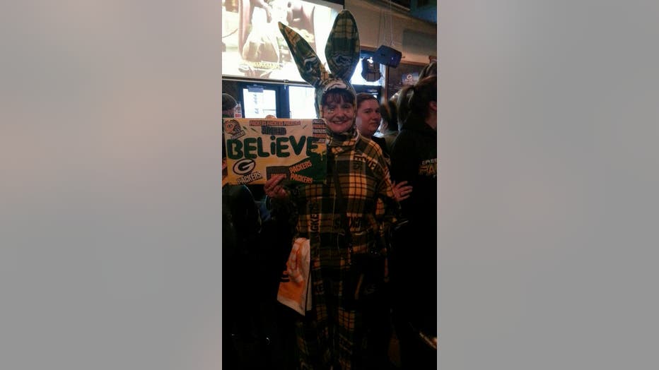 Charbonneau, of Norway, Michigan walked the room giving high fives and asking people to squeeze her tail for luck! Charbonneau says she had to be in Green Bay for Sunday's game.