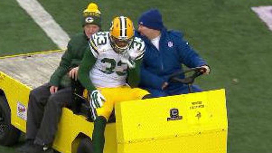 Shortly after the Vikings touchdown, a cart came onto the field for S Micah Hyde. He has a hip injury, and his return is questionable. Jeff Janis would take over for Hyde.
