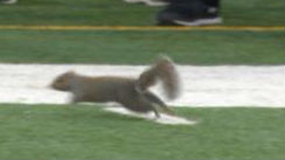 Wayward squirrel on the field -- Packers vs. Vikings