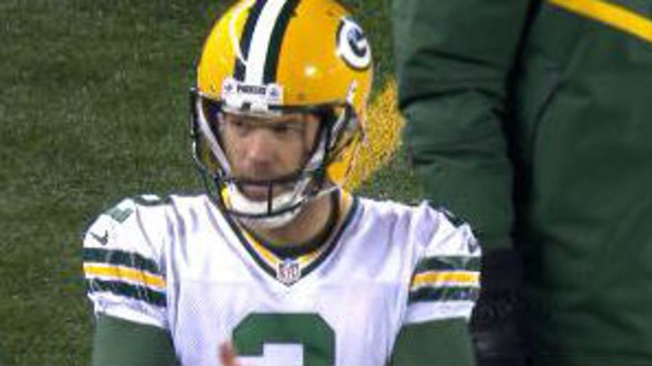 The Packers' drive stalled, and Crosby came onto the field to try for a field goal.