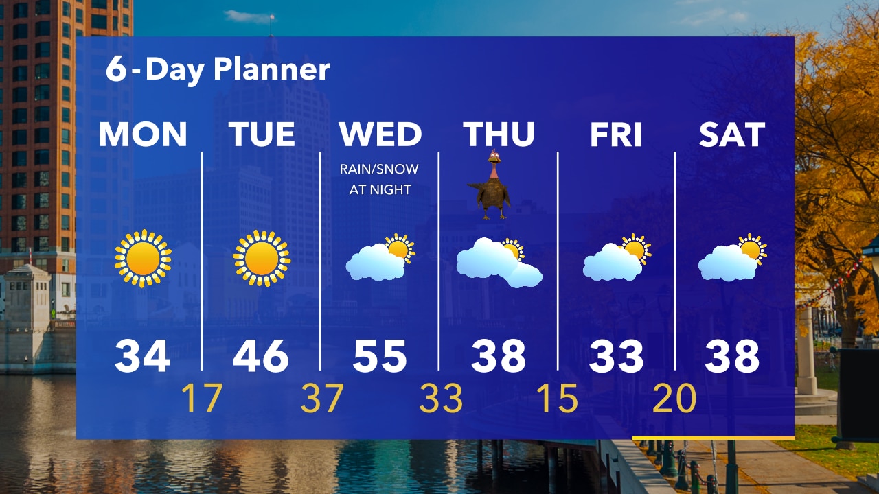 Coldest morning of the season Monday with temperatures in the teens at sunrise and wind chills in the single digits. Sunny during the day with highs in the 30s.