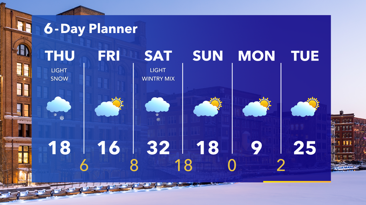 A few light snow showers or flurries are possible overnight. It will stay cold with temperatures in the teens and wind chills at or below zero. Another cold day on Thursday with off-and-on snow showers.